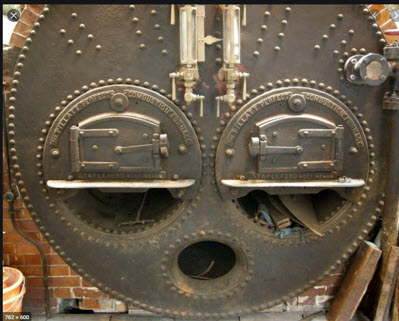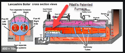 Factory machinery at that time was driven by steam provided by either Cornish-one flue or Lancashire two flues-boilers. The boiler was about 28 feet long and consisted of a flue (a pipe leading from the furnace to the outside) surrounded by a water jacket. A fire was lit at the end of the flue, in what is called the furnace, and the hot air created then travelled past the water jacket creating steam before exiting via another flue and a chimney. Pillatts made the firebars which formed the base of the furnace, and on which the coal burned. These degraded because of the heat and had to be periodically replaced. Andrew’s invention was to redesign the fire bars so that they were hollow which enabled them to be cooled, and meant that they lasted longer and the fire burned more efficiently. The furnace itself was also redesigned.