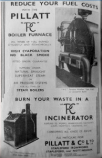 In the 1920s and 1930s the purchase and sale of large boilers ceased although sets of firebars were sold to be fitted on site. A good example being Papplewick Pumping Station, where three of the boilers have been retrofitted with furnaces supplied by Pillatts. The company’s trade report for 1928 describes the merits of their ‘Patent Perfect Combustion Furnaces’ for all types of boilers. They are either rocking or stationery types and enable small inferior fuels to be used with maximum results. They give big economies in fuel costs and a device completely overcomes smoke nuisance. Air channels keep the bars cool and these give the bars a long life.[22] The original patents had by this time expired but in 1931 they filed a patent for ‘the improvement in or relating to incinerators and the like’[23] and the sale of this incinerator, known as the ‘PC’, became one of their main products.