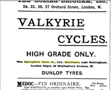 The cycles that Springfield made were sold under the brand name ‘Valkeyrie. ‘ [18] Wagner ‘s opera, Die Walkürie, was first performed in 1870 and the opening of Act 3 features the ‘Ride of the Valkeyrie’ as they ride into battle on their flying horses-symbolism which would not have been lost on the purchasers of the Sandiacre product. The cycles were of high quality and were of particular interest to racing enthusiasts and those who liked speed. ‘The machines were extraordinarily light yet combined with that lightness a strength truly remarkable. ‘ [19] Their advertisements informed intending buyers that they were ‘High Grade only, ‘ Some said that they were the ‘highest grade cycle in the world ‘ and from ‘Mr Hooley’s big factory ‘. In March 1897 the ‘Valkyrie ‘ was described as the fastest machine built. [20]