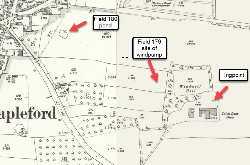 Fourthly, the source of the water. It may have been a well but the extraction of water when the pump was activated would probably have soon drained it. The more likely source would be the pond shown on the map at the lower end of field No. 180. This field was part of the farm and the water would be free and reasonably reliable. A pump of the type referred to above would be fully capable of lifting water from the pond, which is approximately 90 ft. lower than the probable site of the windpump.