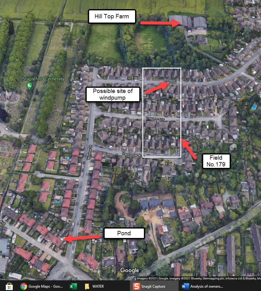 Most of this land has now been built over. Field No. 179, in which the wind-pump stood, is outlined in white in the above aerial photograph. House nos. 11 to 21 Blake Road form the eastern boundary and back on to field No. 231, then and now a small wooded area. In addition, the field would also have included 10-20 Blake Road, 5-10 and 33-38 Trevone Avenue, and 5-10 Lancaster Avenue. The western hedge line would have run down the middle of Lancaster Avenue. Windsor Street runs down the middle of field no.180 and the pond from which the water was pumped is now occupied by 10-16 Cliffe Hill Avenue. The trigpoint is still there, deep in a hedge.[7]