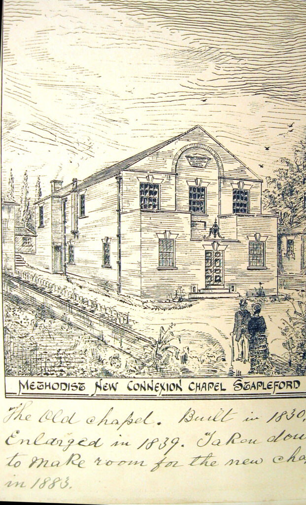 Methodism found a welcome reception in Stapleford. In 1829 the Parish Constable, Joseph Butler, made a return stating that there were two places of Publick Worship exclusive of the Church of England both of the Methodist persuasion. These were Wesley Place and Providence Chapel on Church Walk.[5]