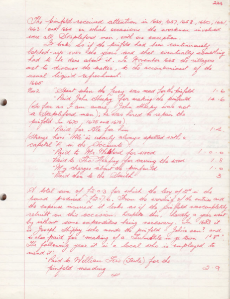 By that time Bernard had moved to the West Country, and it was not until April that we were able to collect the papers from a small village deep in Exmoor. After sorting through them, we managed—fortunately—to fit the Stapleford papers into the car boot and back seat, and brought them home for closer examination. Among them were numerous notebooks containing Ralph’s notes and many old copies of documents from the Public Record Office, but the most important were the two histories of Stapleford that Ralph had written.