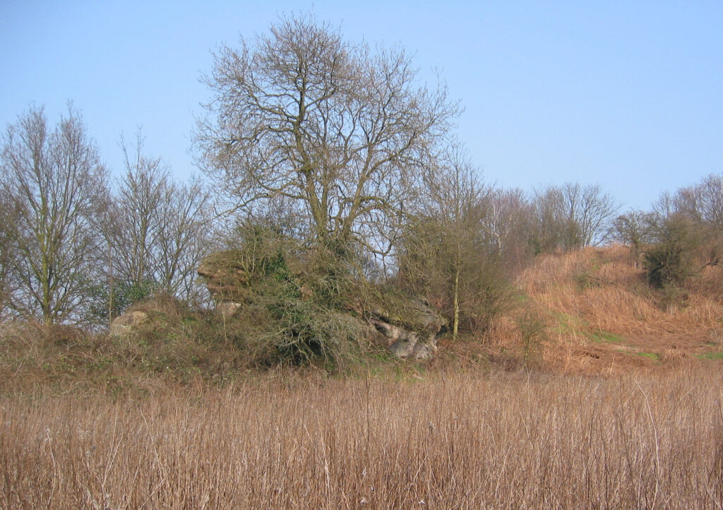 The rock can be viewed by accessing the wooded area to the east of the cemetery. It is possible to go down into the amphitheatre, the local children still play there, but the two paths down are steep and can be slippy. Here again the area has become very overgrown and the best time to see the rock is in early Spring before the new foliage obscures the view and after last year's growth has died down. Photographically this means, unfortunately, that the colour of the dead bracken dominates the scene. In 2022 Mountain Bike activity was reported here and access is much easier.